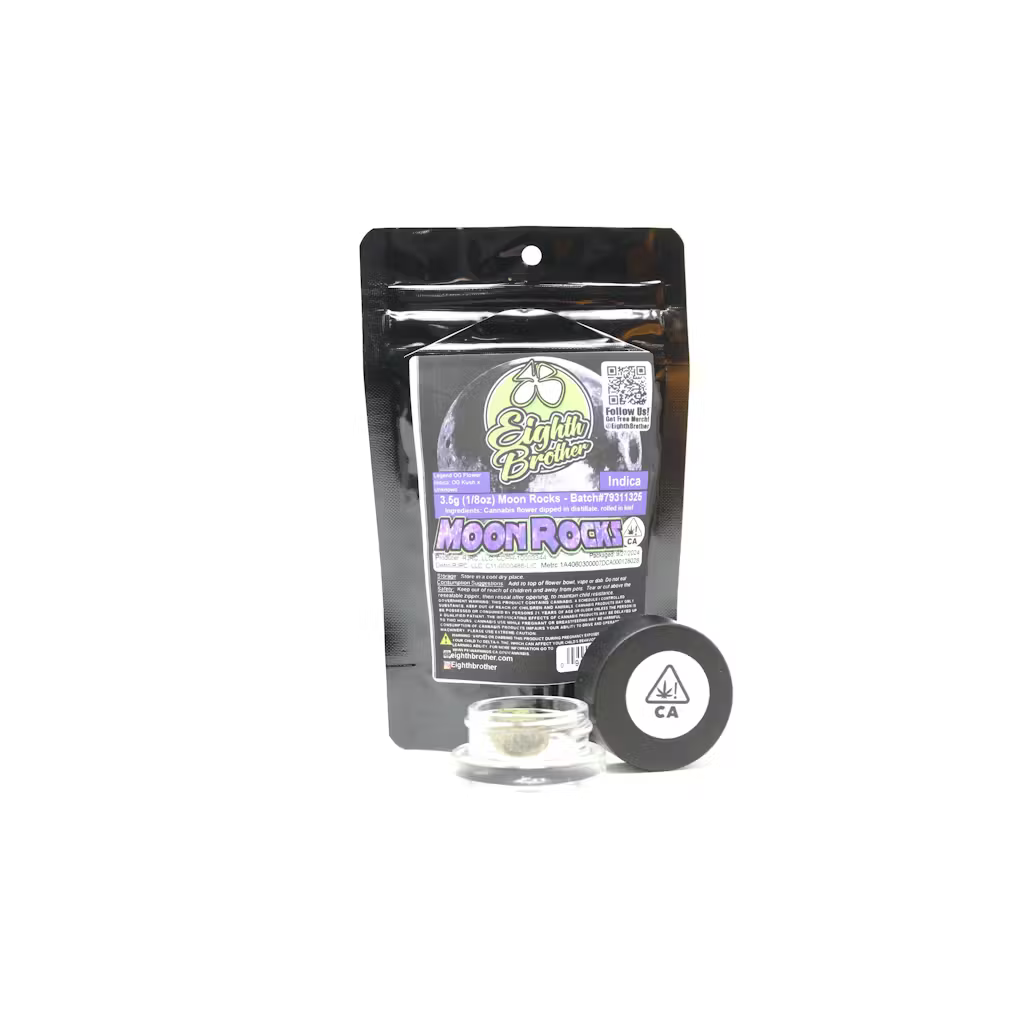 At Eighth Brother, our MoonRocks are specially crafted for those smokers looking for something a notch above your typical flower smoking experience. We start with our teams favorite outdoor strains, we take those nugs and infuse them with our top shelf concentrate, they are then rolled in fresh kief to create a fuzzy looking rock that will send you to outer space. Affordably priced, our MoonRocks are the perfect addition to a bowl or joint after a long day, or smoke great all on their own out of the pipe.