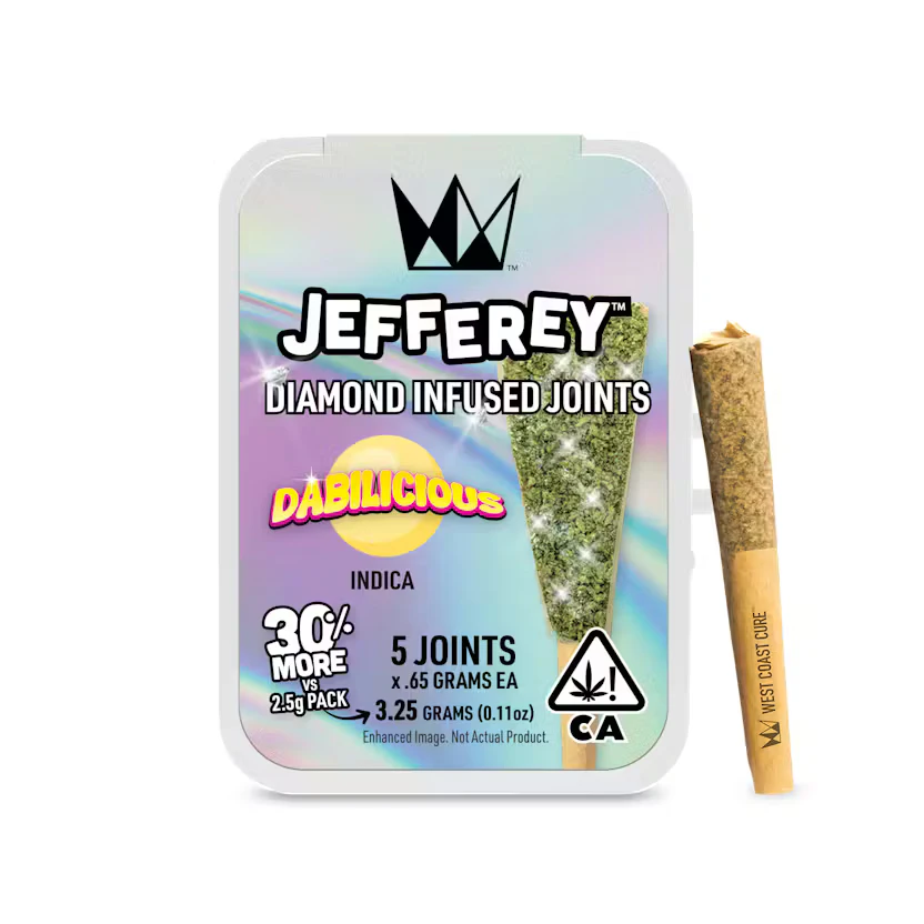 WCC's Dabilicious Jefferey 5-Pack is where nostalgia meets potency! A blast from the past with its old-school zest, each .65g mini-but-mighty joint is infused with whole nug flower, live resin diamonds, and high-end kief - creating a deliciously strong experience. Offering the perfect blend of retro vibes with modern strength – it's an infused trip down memory lane with a twist of clarity.