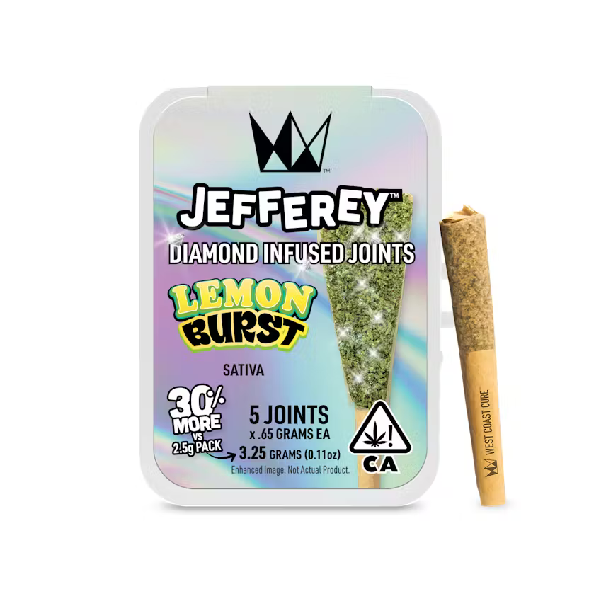 The Lemon Burst Jefferey .65g 5-pack offers an invigorating Sativa experience, ideal for enhancing creativity or social engagements. Each joint is carefully crafted using high-quality flower, infused with live resin diamonds, and dusted with top-shelf kief. The addition of all-natural terpenes enhances the robust, citrusy flavor, making this pack a premium choice for those seeking a potent and flavorful cannabis experience. Perfect for both new and seasoned enthusiasts.